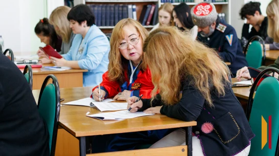 Елена Дерганова и Сергей Афанасьев приняли участие в этнографическом диктанте. Фото - министерство внутренней политики Воронежской области